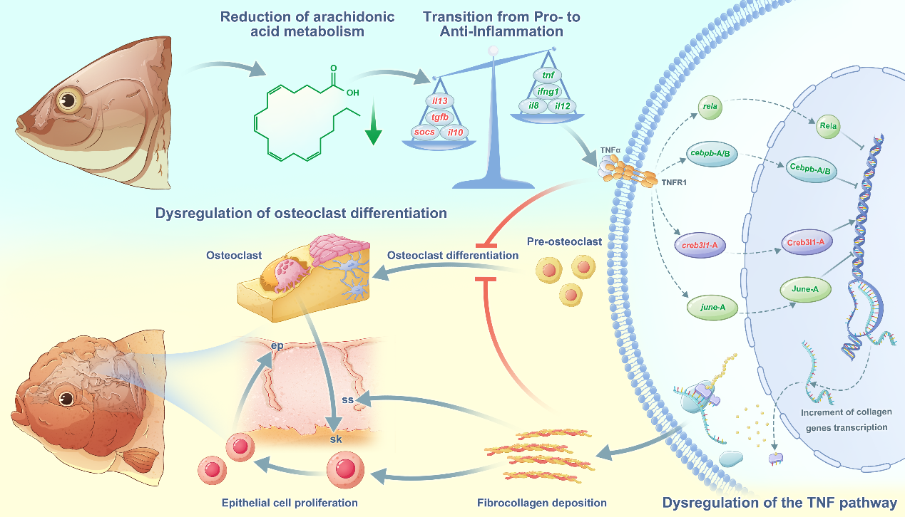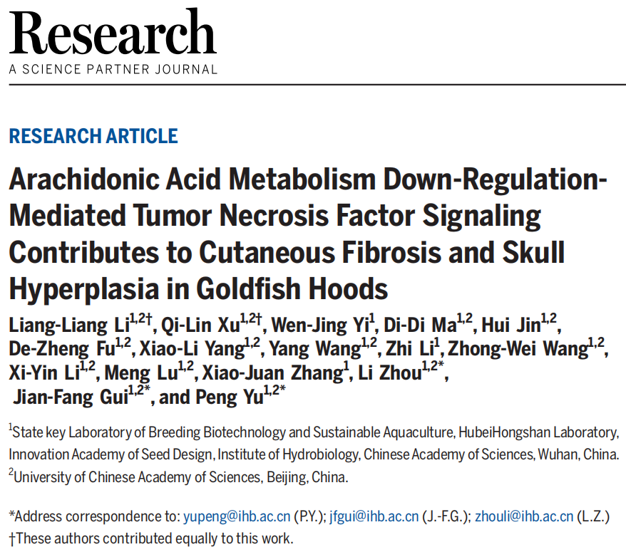 近期,中國科學院水生生物研究所桂建芳院士團隊在Research上發表了題為“Arachidonic acid metabolism downregulation-mediated TNF signaling contributes to cutaneous fibrosis and skull hyperplasia in goldfish hoods”的研究論文,團隊發現,獅頭金魚的頭瘤本質上是一種皮膚纖維化結構,富含纖維型膠原蛋白;進一步研究揭示,花生四烯酸代謝的下調通過引起TNF信號通路的異常表達,促進膠原蛋白異常沉積與顱骨結構改變,從而驅動頭瘤的形態發生。該研究不僅首次系統解析了金魚頭瘤形成的細胞與分子機制,為觀賞魚性狀選育提供了理論依據,也為人類纖維化疾病的研究提供了新的視角。