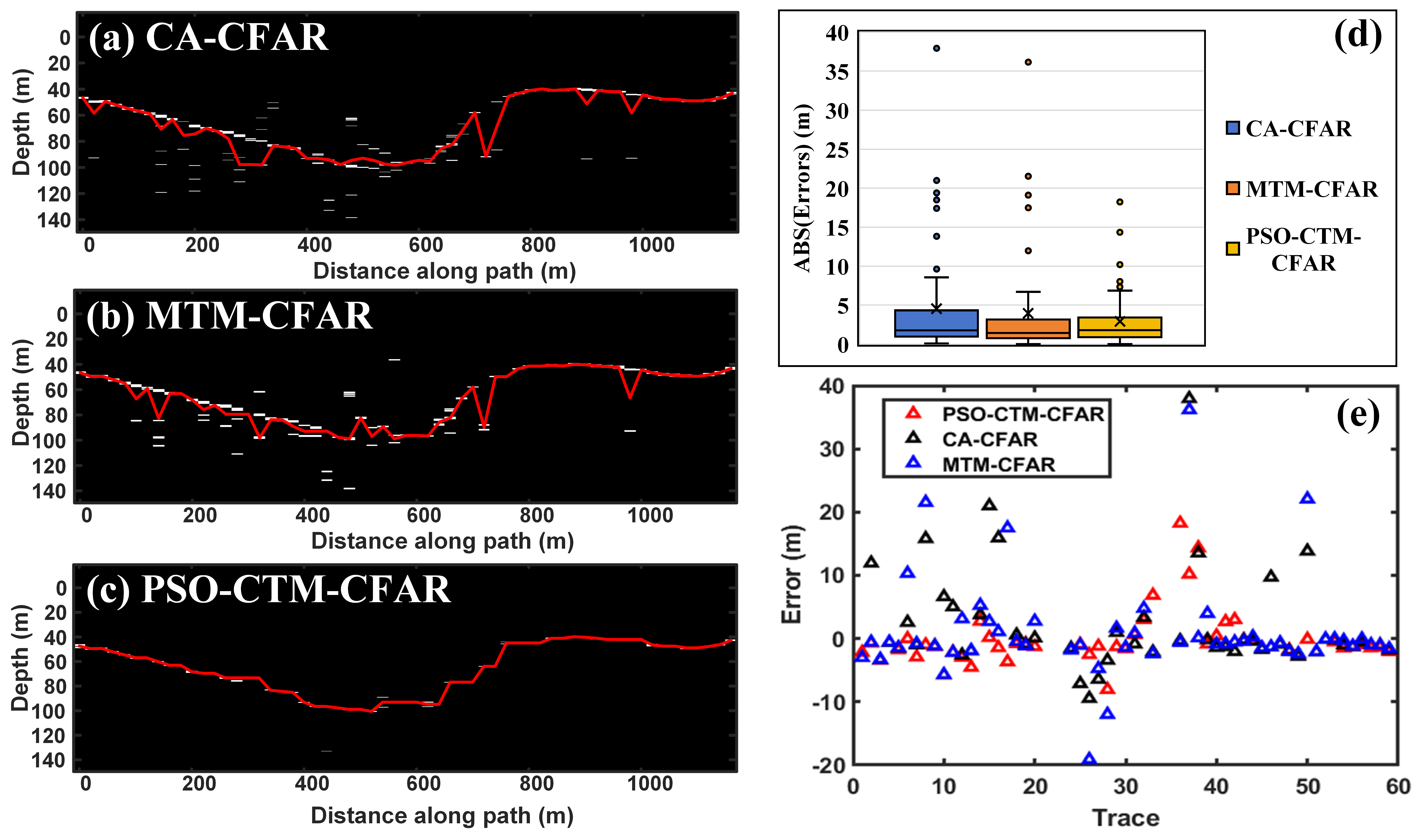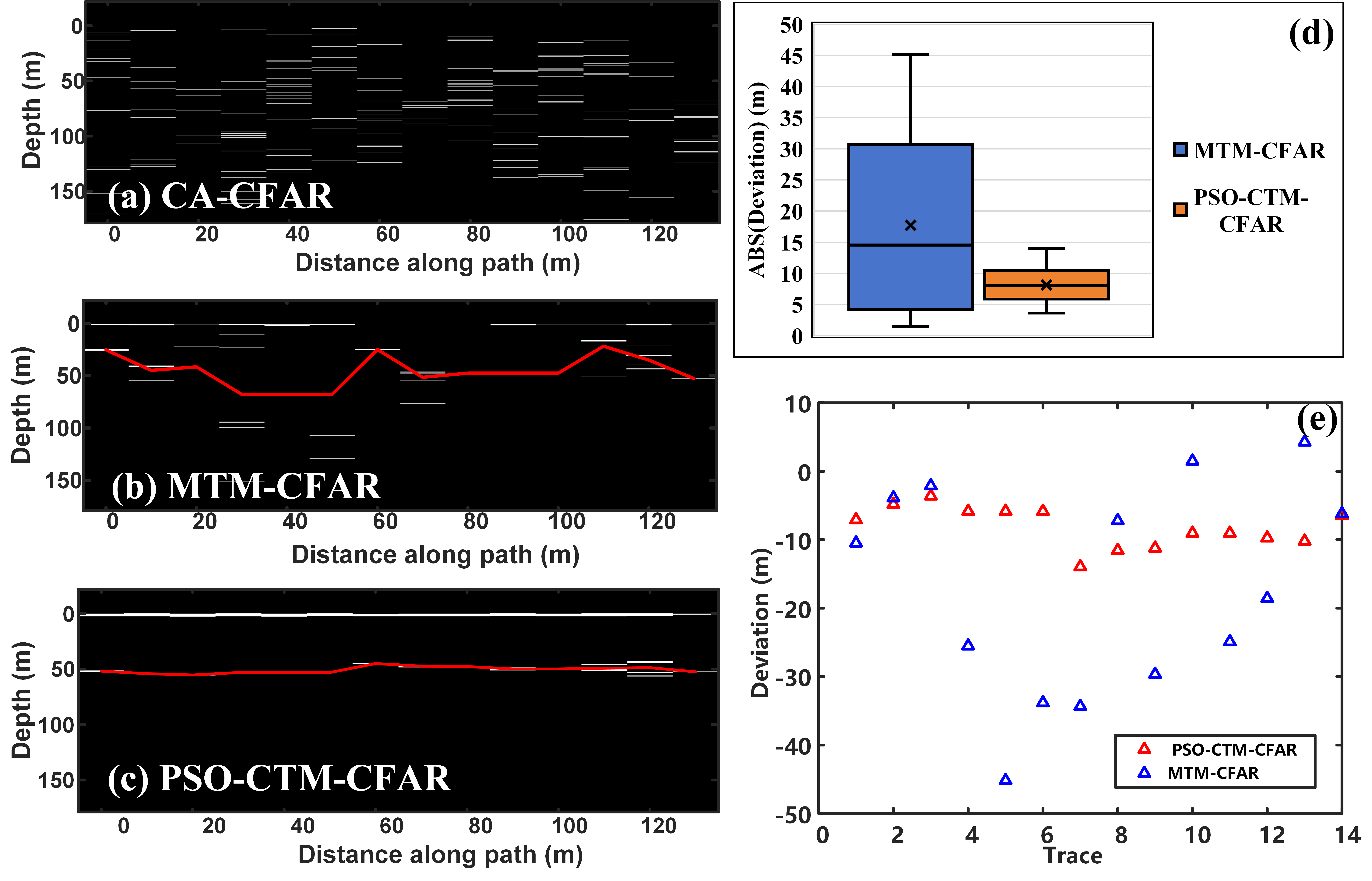 (a)-(c)八一冰川04測線冰巖界面起伏特征;(d)-(e)3種基于CFAR的方法的測量誤差對比