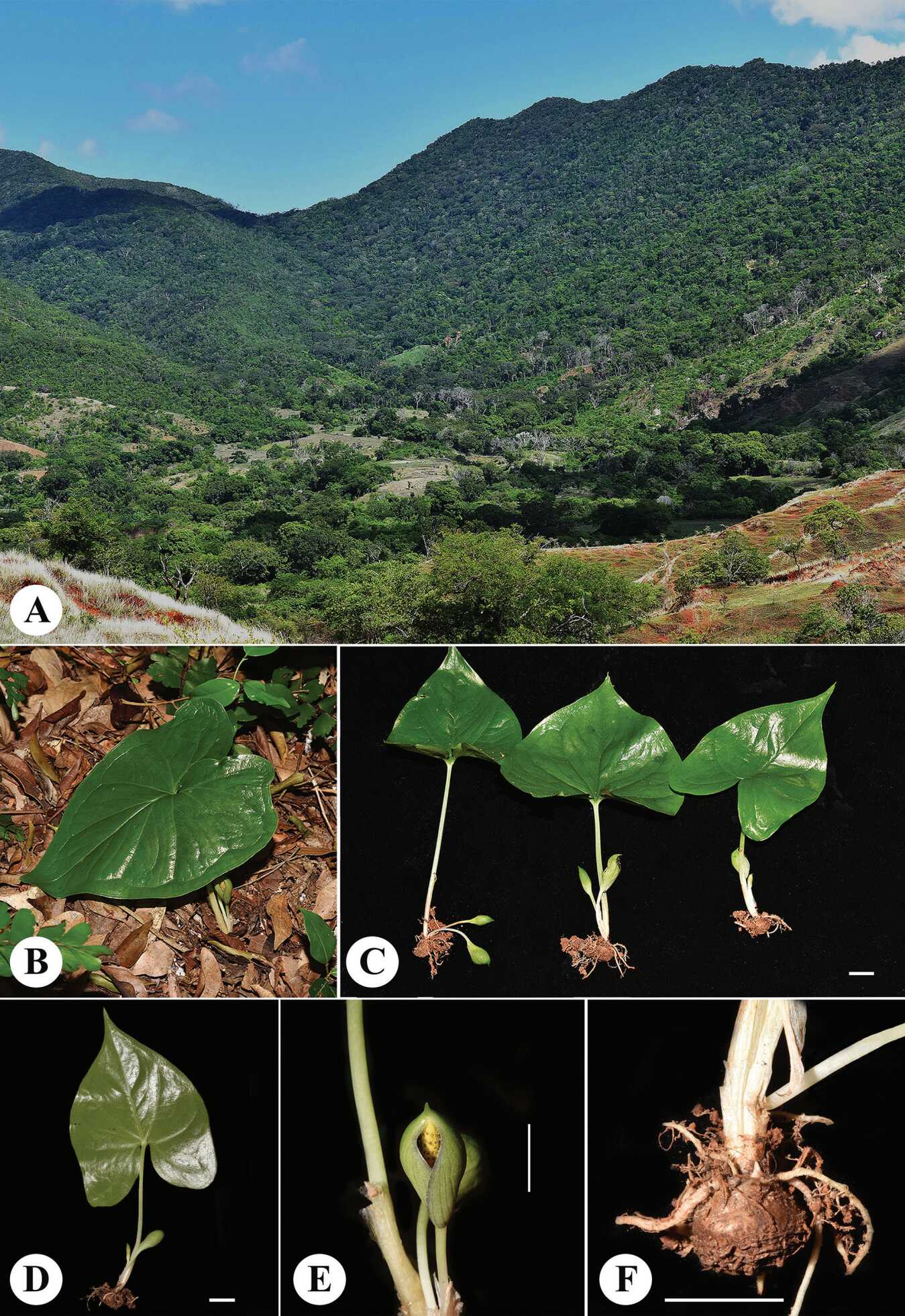 2025年1月,中國科學院武漢植物園植物多樣性與進化研究組成員,與津巴扎扎動植物園(Parc Botanique et Zoologique de Tsimbazaza)和塔那那利佛大學(University of Antananarivo)組成聯合科考隊。在馬達加斯加北部達萊納(Daraina)地區進行野外本底調查期間,關注到一個林下地生的灰巖芋屬居群,而該屬植物通常被認為是典型的石生類型。經野外初步觀察,該灰巖芋屬植物葉為寬心形-箭形,與2012年在該地區發表的Carlephyton darainense相似,但其黃色的肉穗花序以及單雄蕊的雄花序,引起了研究人員的注意(圖1)。考察隊隨即采集了足夠的憑證標本、活體等研究材料。